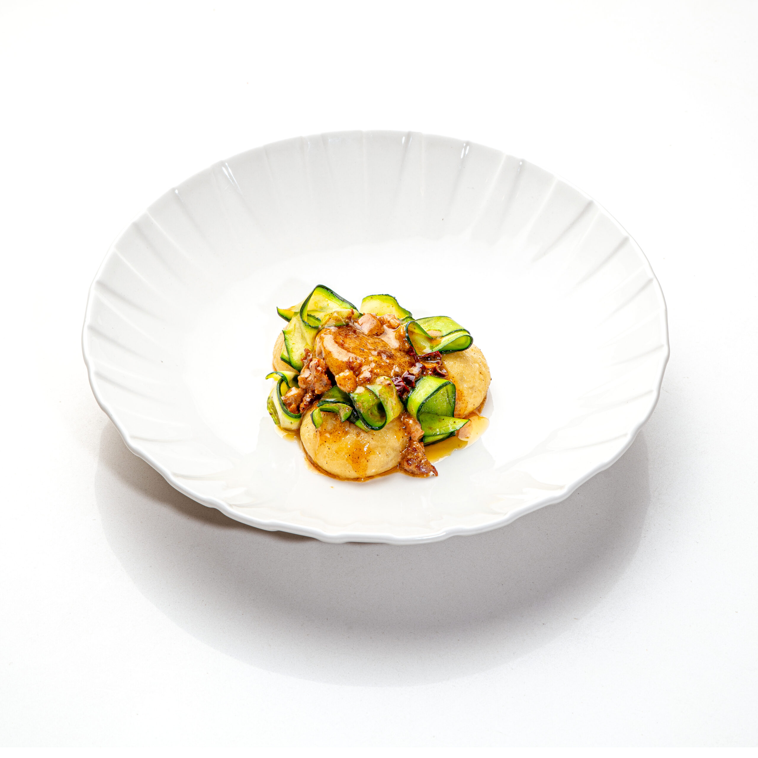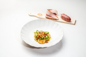 Una combinazione spaziale scelta dai cuochi della Red con un un trittico di sapori — la sapidità del guanciale, la grassezza aromatica della salsiccia e la dolcezza della zucchina — che si sposa a meraviglia con la testura morbida dello gnocco.